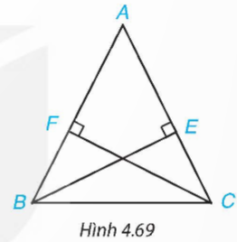 Cho tam giác ABC cân tại A và các điểm E, F lần lượt nằm trên các cạnh AC, AB sao cho BE vuông góc với AC, CF vuông góc với AB (H.4.69). Chứng minh rằng BE = CF.