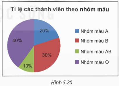 Biểu đồ Hình 5.20 cho biết tỉ lệ thành viên theo nhóm máu của một đội hiến máu gồm 200 tình nguyện viên. Hỏi: