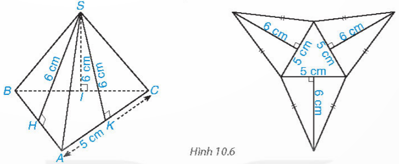 Quan sát hình chóp tam giác đều và hình khai triển của nó (H.10.6). Hãy tính tổng diện tích các mặt bên của hình chóp.