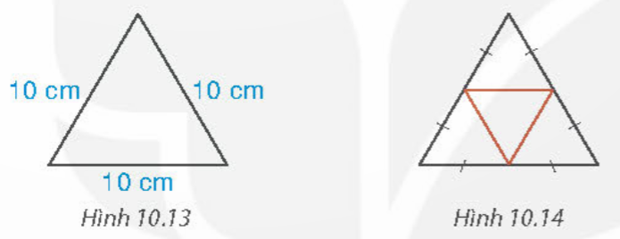 Vẽ và cắt một tam giác đều có cạnh 10 cm (H10.13) rồi gấp theo đường màu cam để được hình chóp tam giác đều (H.10.14).
