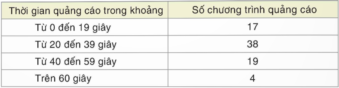 c) Số chương trình quảng cáo kéo dài từ 20 đến 59 giây là: 38 + 19