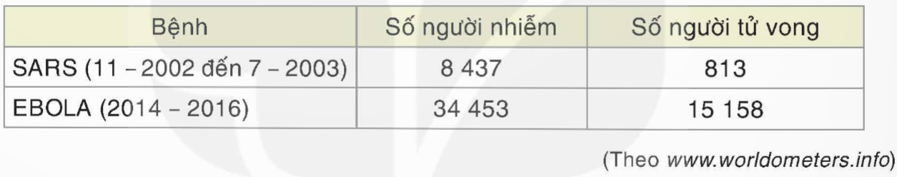 Thống kê về số ca nhiễm bệnh và số ca tử vong của bệnh SARS và bệnh EBOLA được kết quả như sau:
