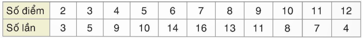 Hai bạn Mai và Việt lần lượt thực hiện việc gieo đồng thời hai con xúc xắc và ở mỗi lần gieo sẽ nhận được số điểm bằng tổng số chấm xuất hiện trên hai con xúc xắc. Mai được gieo 100 lần và Việt được gieo 120 lần. Mai gieo trước và ghi lại kết quả của mình như sau: