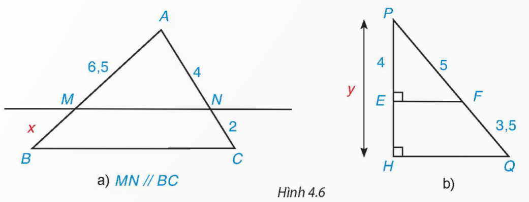 Tìm các độ dài x, y trong Hình 4.6.