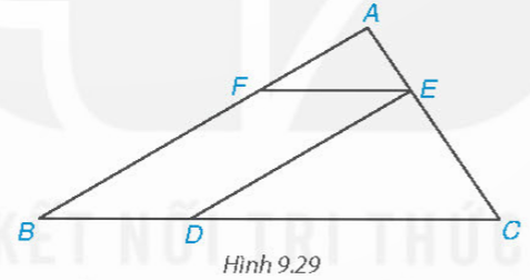 Cho các điểm A, B, C, D, E, F như Hình 9.29. Biết rằng DE // AB, EF // BC, DE = 4 cm, AB = 6 cm. Chứng minh rằng Δ AEF ∽ Δ ECD và tính tỉ số đồng dạng.