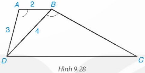 b) Giả sử AB = 2 cm, AD = 3 cm, BD = 4 cm. Tính độ dài các cạnh BC và DC.