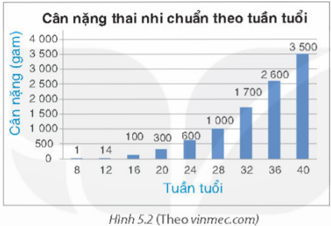 Biểu đồ Hình 5.2 cho biết cân nặng thai nhi chuẩn tại một số thời điểm trong thai kì.