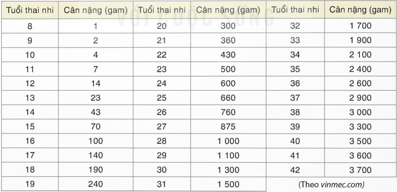 Bảng sau cho biết cân nặng thai nhi chuẩn theo tuần tuổi: