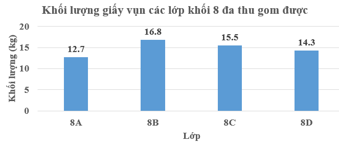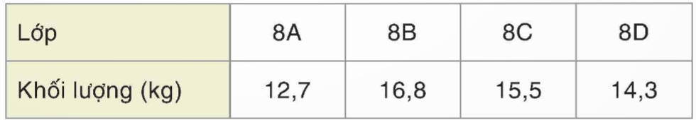 Bảng sau cho biết khối lượng giấy vụn các lớp khối 8 đa thu gom được.