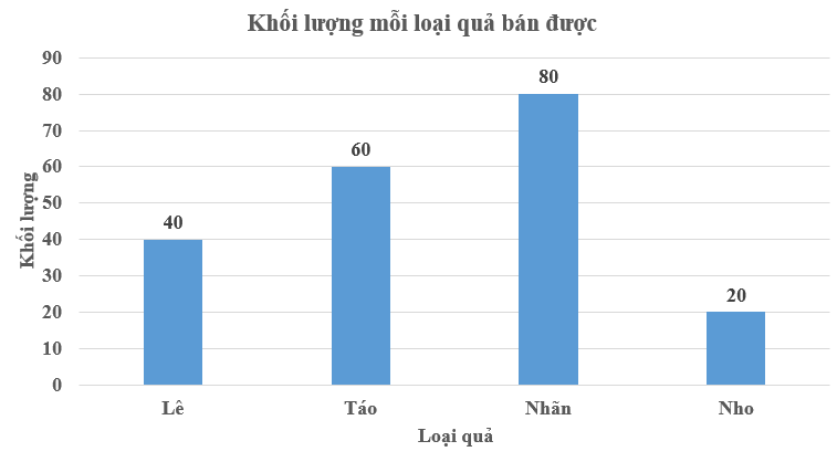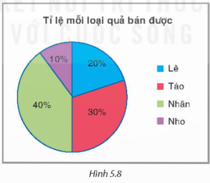 Biểu đồ Hình 5.8 cho biết tỉ lệ mỗi loại quả bán được của một cửa hàng. Giả sử cửa hàng bán được 200 kg quả các loại. Lập bảng thống kê cho biết số lượng mỗi loại quả bán được. Vẽ biểu đồ cột biểu diễn bảng thống kê này.
