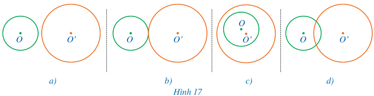 Xác định vị trí tương đối của hai đường tròn (O) và (O’) trong mỗi hình 17a, 17b, 17c, 17d: