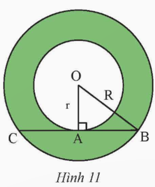 Cho hình vành khuyên giới hạn bởi hai đường tròn (O; r) và (O; R) với R > r. Trên đường tròn (O; R) lấy hai điểm B, C sao cho BC vừa là dây cung của (O; R), vừa là tiếp tuyến của đường tròn (O; r) tại A (Hình 11).