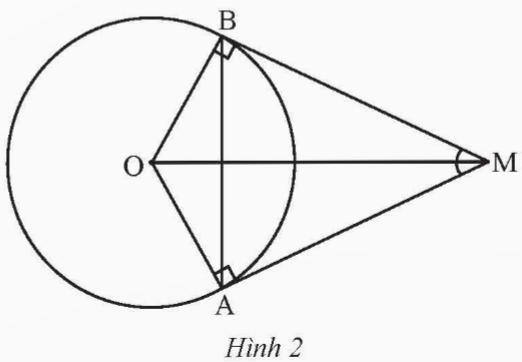 Cho hai tiếp tuyến của đường tròn (O) tại A và B cắt nhau tại M (Hình 2). Biết