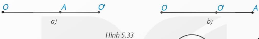 Trên hình 5.33a, ta có OO' = OA + O'A; trên Hình 5,33b, ta có OO' = OA - O'A. Trong mỗi trường hợp, hãy vẽ hai đường tròn (O; OA) và (O'; O'A) và cho biết hai đường tròn đó có mấy điểm chung?