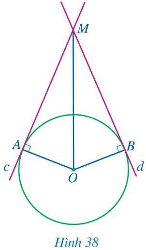 Cho đường tròn (O; R). Các đường thẳng c, d lần lượt tiếp xúc với đường tròn (O; R) tại A, B và cắt nhau tại M (Hình 38).