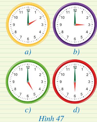 Trong Hình 47, coi mỗi khung đồng hồ là một đường tròn, kim giờ, kim phút là các tia. Số đo góc ở tâm trong mỗi hình 47a, 47b, 47c, 47d là bao nhiêu?