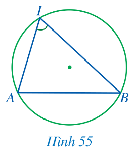 Trong Hình 55, đỉnh của góc AIB có thuộc đường tròn hay không? Hai cạnh của góc chứa hai dây cung nào của đường tròn?