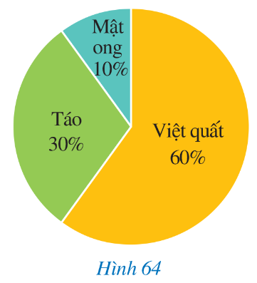 Biểu đồ hình quạt tròn ở Hình 64 mô tả các thành phần của một chai nước ép hoa quả (tính theo tỉ số phần trăm). Hãy cho biết các cung tương ứng với phần biểu diễn thành phần việt quất, táo, mật ong lần lượt có số đo là bao nhiêu độ.