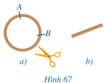 a) Đánh dấu hai điểm A, B trên một vòng dây không dãn có dạng đường tròn (Hình 67a), cắt cung AB của vòng dây và kéo thẳng cung đó để nhận được sợi dây như ở Hình 67b.