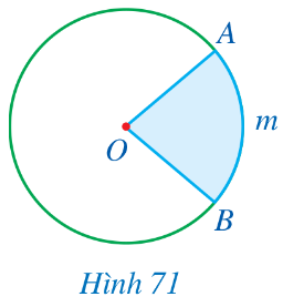 Quan sát Hình 71, hãy cho biết phần hình tròn (O) tô màu xanh được giới hạn bởi hai bán kính và cung nào?