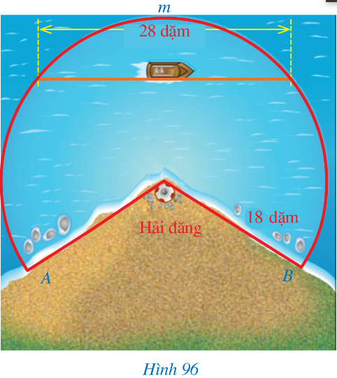 Hình 96 biểu diễn vùng biển được chiếu sáng bởi một hải đăng có dạng một hình quạt tròn với bán kính 18 dặm, cung AmB có số đo 245o.