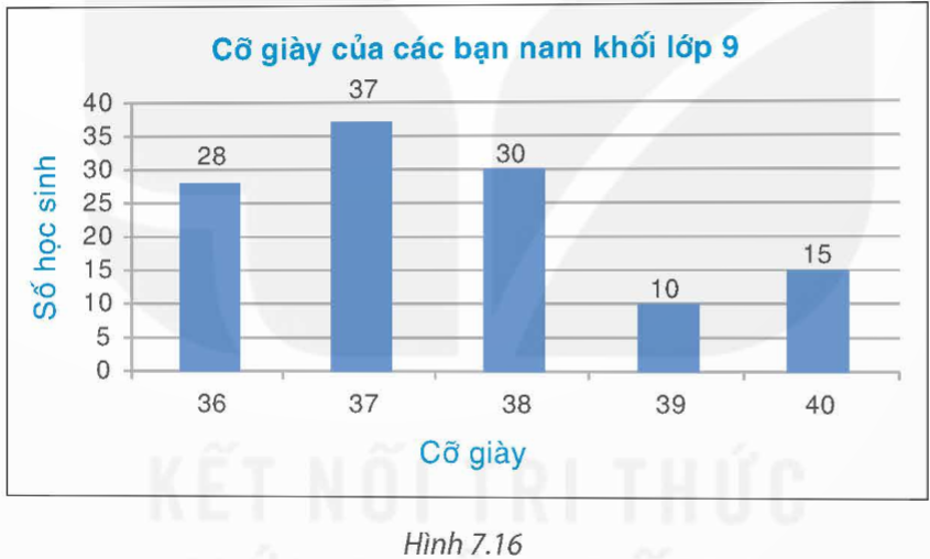 Biểu đồ cột Hình 7.16 cho biết cỡ giày của các bạn nam khối lớp 9 trong trường.