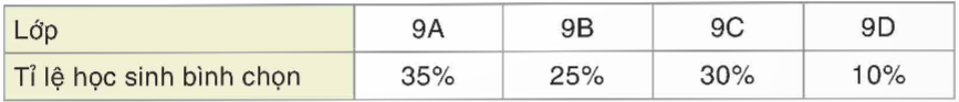 Số học sinh bình chọn cho các tiết mục của các lớp 9A, 9B, 9C, 9D tương ứng là: