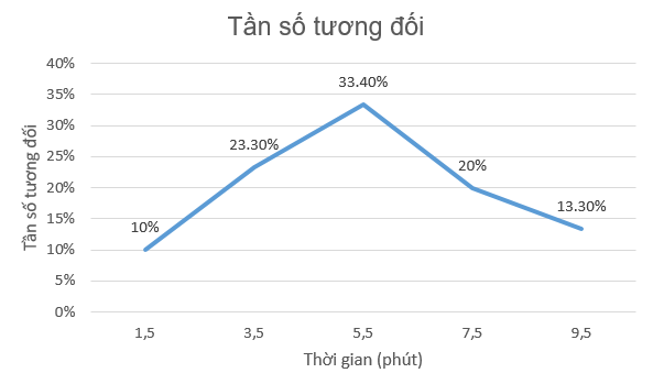 | Thời gian (phút) | [0,5; 2,5) | [2,5; 4,5) | [4,5; 6,5) | [6,5; 8,5) | [8,5; 10,5) |