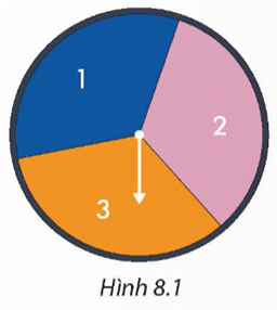Một tấm bìa cứng hình tròn được chia làm ba hình quạt bằng nhau, đánh số 1; 2; 3 và được gắn vào trục quay có mũi tên cố định ở tâm (H.8.1). Bạn Hiền quay tấm bìa liên tiếp hai lần và quan sát xem mũi tên chỉ vào hình quạt nào khi tấm bìa dừng lại.