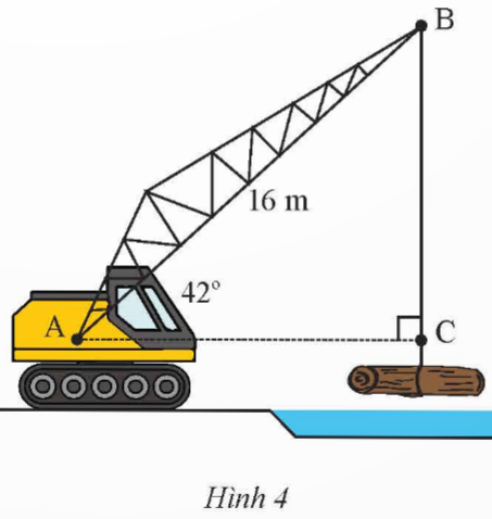 Một cần cẩu đang nâng một khối gõ trên sông. Biết tay cẩu AB có chiều dài là 16 m và nghiêng một góc 42o so với phương nằm ngang (Hình 4). Tính chiều dài BC của đoạn dây cáp (kết quả làm tròn đến hàng phần mười).
