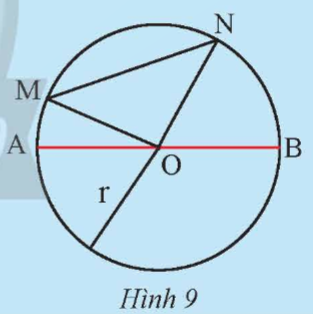 Trên đường tròn (O; R), lấy bốn điểm A, B, M, N sao cho AB đi qua O và MN không đi qua O (Hình 9).