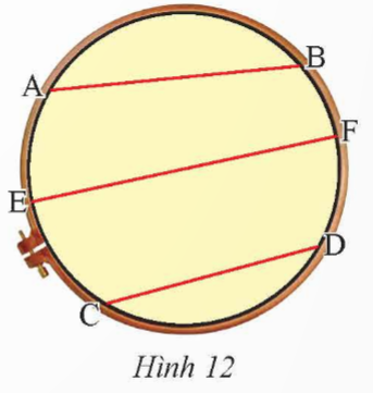Bạn Mai căng ba đoạn chỉ AB, CD, EF có độ dài lần lượt là 16 cm, 14 cm và 20 cm trên một khung thêu hình tròn bán kính 10 cm (Hình 12). Trong ba dây trên, dây nào đi qua tâm của đường tròn? Giải thích.