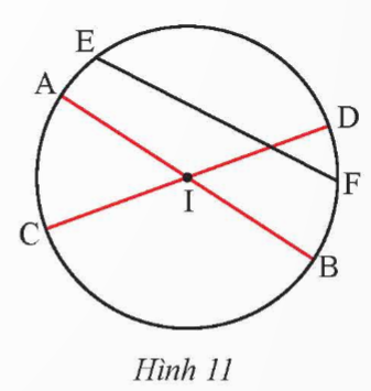 Cho đường tròn (I) có các dây cung AB, CD, EF. Cho biết AB và CD đi qua tâm I, EF không đi qua I (Hình 11). Hãy so sánh độ dài AB, CD, EF.