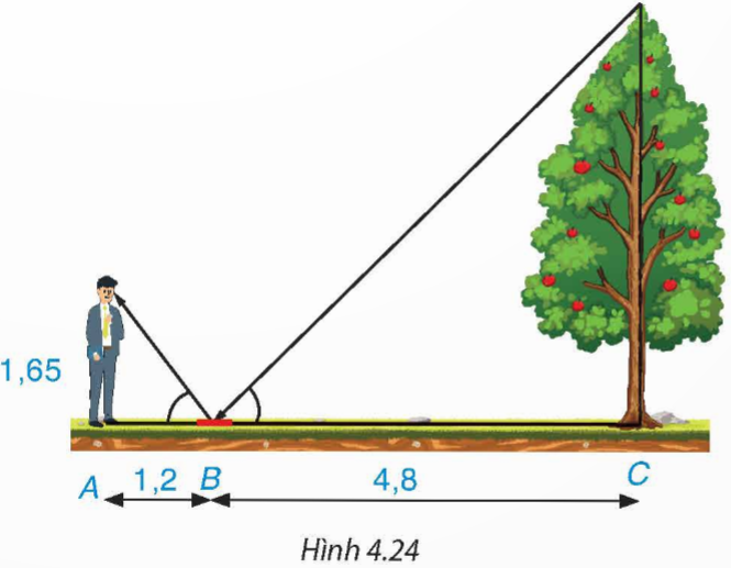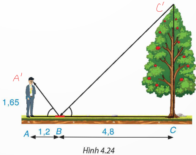 Một người đứng tại điểm A, cách gương phẳng đặt nằm trên mặt đất tại điểm B là 1,2 m, nhìn thấy hình phản chiếu qua gương B của ngọn cây (cây mọc thẳng đứng, có gốc ở tại điểm C cách B là 4,8 m, B nằm giữa A và C). Biết khoảng cách từ mặt đất đến mắt người đó là 1,65 m. Tính chiều cao của cây (H.4.24).