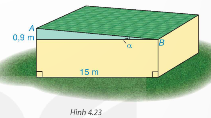 Tìm góc nghiêng α và chiều rộng AB của mái nhà kho trong Hình 4.23 (góc làm tròn đến độ, độ dài làm tròn đến dm)