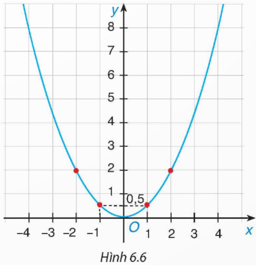 \(y=\frac{1}{2}x^2\). Tìm các điểm thuộc đồ thị có tung độ bằng 2 và nhận xét về tính đối xứng giữa các điểm đó.