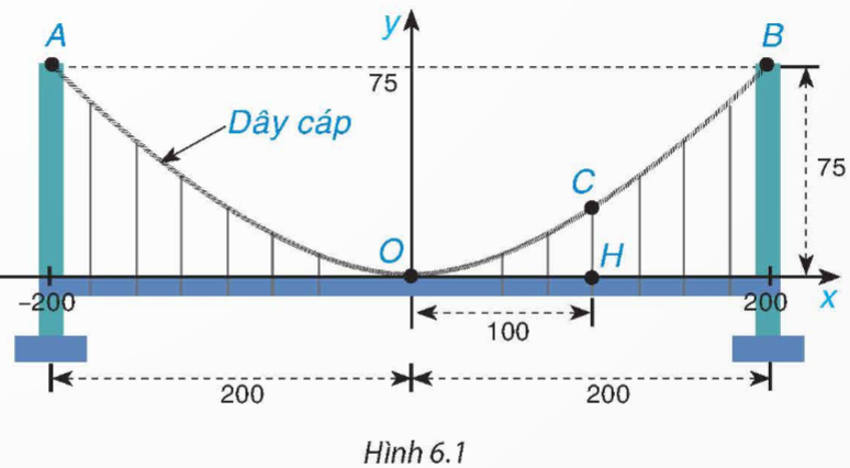 Tình huống: Một cây cầu treo có trụ tháp đôi cao 75 m so với mặt của cây cầu và cách nhau 400 m. Các dây cáp có dạng đồ thị của hàm số y = ax2 (a ≠ 0) như Hình 6.1 và được treo trên các đỉnh tháp. Tìm chiều cao CH của dây cáp biết điểm H cách tâm O của cây cầu 100 m (giả sử mặt của cây cầu là bằng phẳng).