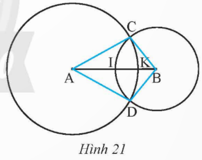 Cho hai đường tròn (A; 6 cm) và (B; 4 cm) cắt nhau tại C và D, AB = 8 cm. Gọi K, I lần lượt là giao điểm của hai đường tròn đã cho với đoạn thẳng AB (Hình 21).