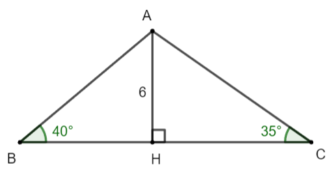 \(\widehat B = 40^\circ , \ \widehat C = 35^\circ\). Tính độ dài các đoạn thẳng AB, BH, AC, BC (làm tròn kết quả đến hàng phần mười của centimét).