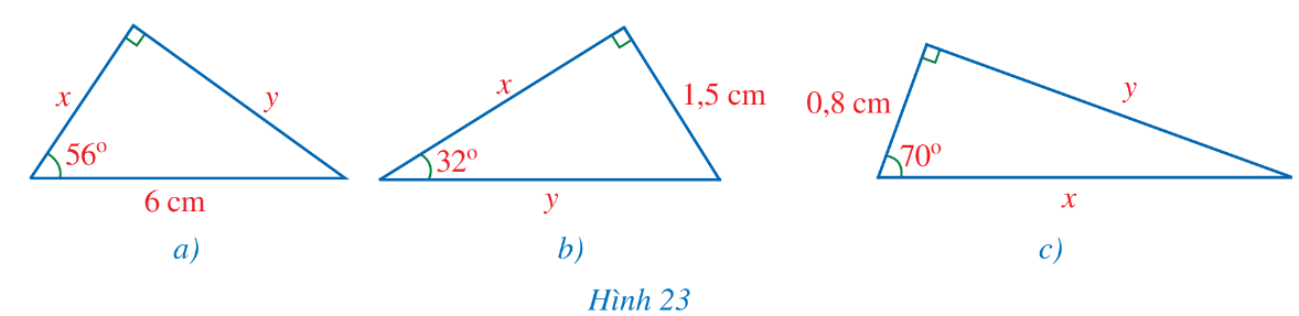 Tìm x, y trong mỗi hình 23a, 23b, 23c (làm tròn kết quả đến hàng phần mười của centimét).