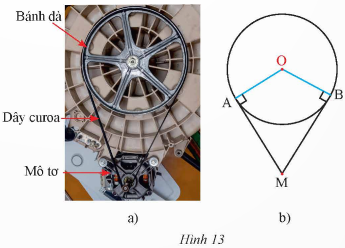 Bánh đà của một động cơ được thiết kế có dạng là một đường tròn tâm O, bán kính 15 cm được kéo bởi một dây curoa. Trục của mô tơ truyền lực được biểu diễn bởi điểm M (Hình 13). Cho biết khoảng cách OM là 35 cm.