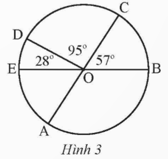 \(\widehat {AOB}\) trong Hình 3. Biết AC và BE là hai đường kính của đường tròn (O).