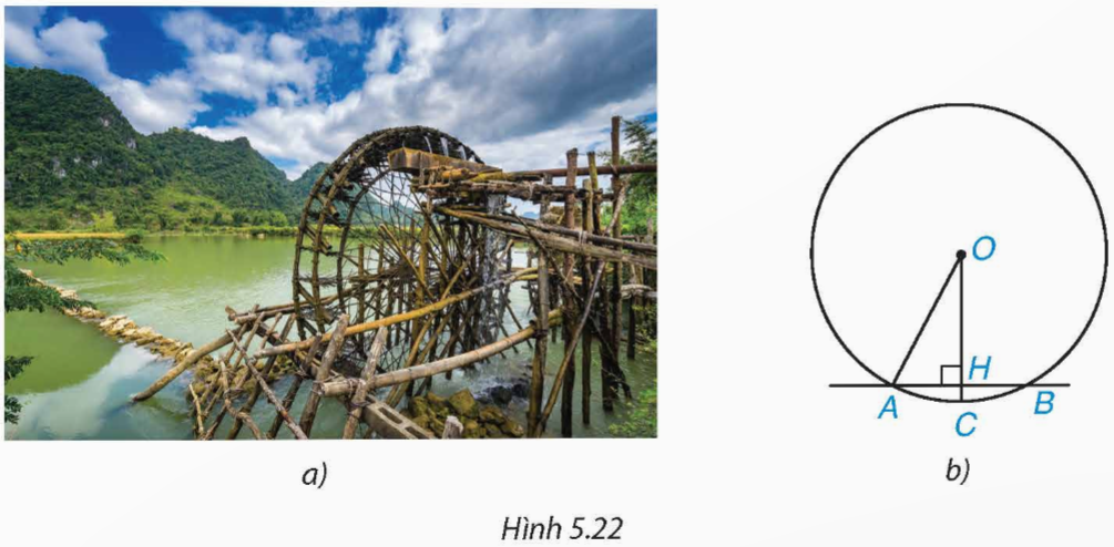 Giả sử ngấn nước ngăn cách giữa phần trên và phần dưới của một guồng nước được biểu thị bởi cung ứng với một dây dài 4 m và điểm ngập sâu nhất là 0,5 m (trên hình 5.22b, điểm ngập sâu nhất là điểm C, ta có AB = 4 m và HC = 0, 5 m). Dựa vào đó, em hãy tính bán kính của guồng nước.
