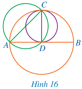 Trong Hình 16, có ba đường tròn với các đường kính lần lượt là AB, AC, CD. Hãy sắp xếp độ dài ba đoạn thẳng AB, AC, CD theo thứ tự tăng dần và giải thích kết quả tìm được.