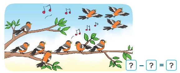 Đếm tất cả số chim có trong hình, số chim bay đi, số chim còn lại trên cành rồi viết phép tính thích hợp.