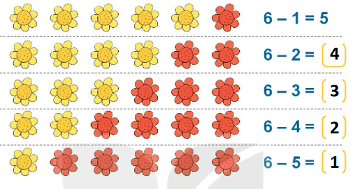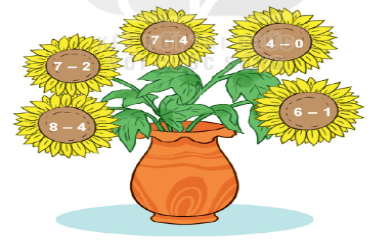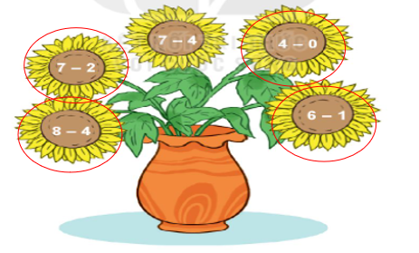 Tính kết quả của mỗi phép trừ để tìm ra bông hoa nào ghi phép tính có kết quả lớn hơn 3.