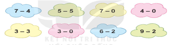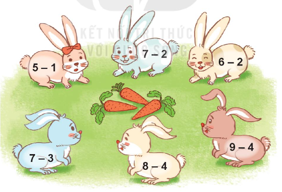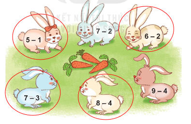 Thực hiện phép trừ sau đó tìm những chú thỏ ghi phép tính có kết quả bằng 4.