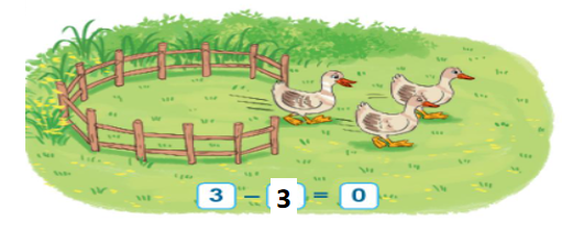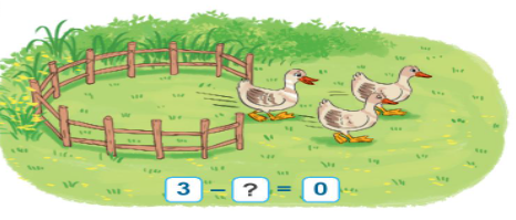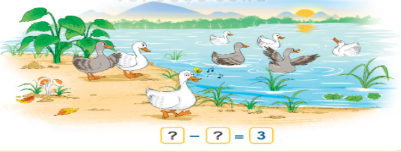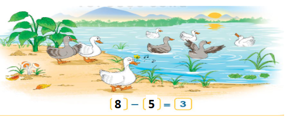 Đếm số con vịt có tất cả và số vịt xuống ao bơi rồi điền số thích hợp.