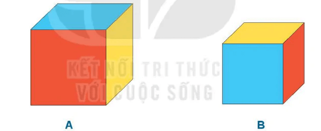 Ở khối lập phương A: mặt trước tô màu đỏ, mặt trên tô màu xanh, mặt bên phải tô màu vàng.