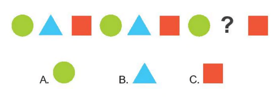 Các hình sắp xếp theo thứ tự là: hình tròn, hình tam giác, hình vuông. Rồi lại tiếp tục lặp lại như vậy